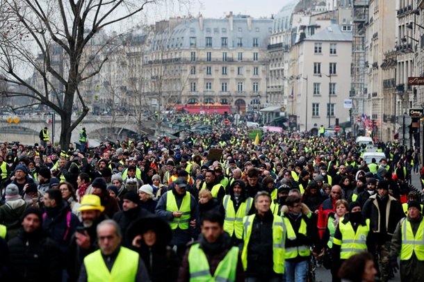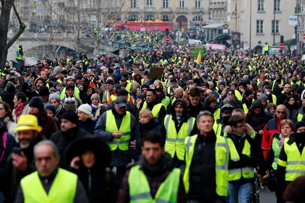 Відзначається, що кілька тисяч протестувальників пройшли від бульвару Єлисейські Поля через центр Парижа. Вони скандували гімн Марсельєза і розмахували плакатами «У відставку Макрона» і «Скасуйте привілеї для еліти».