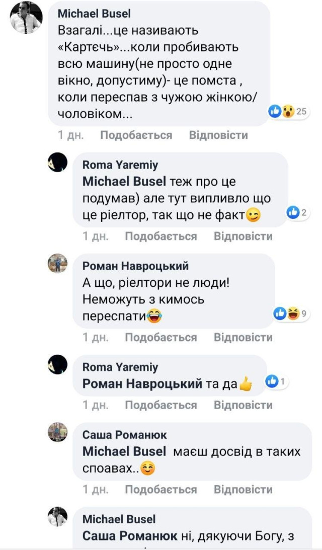 А взагалі, що за ситуація, припаркувався? ріелтор? хто дає право бити машину? Таке враження, що в нас ідеальне суспільство, ніхто не пише про уродів, що побили машину, а зразу риють 130, таке враження, що гвалтівник.