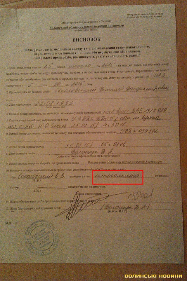 Згідно із результатами експертизи, у крові водія виявили не менш, ніж 1,62 проміле алкоголю.