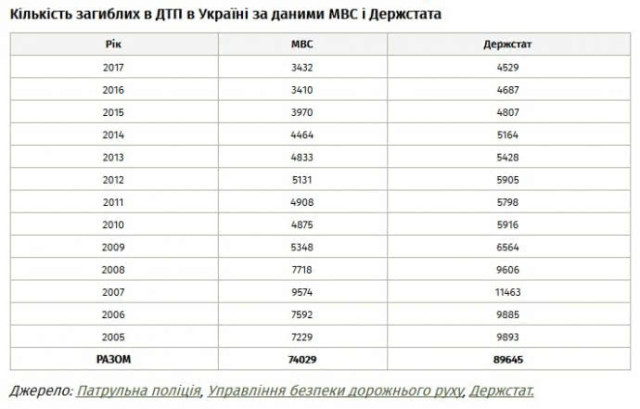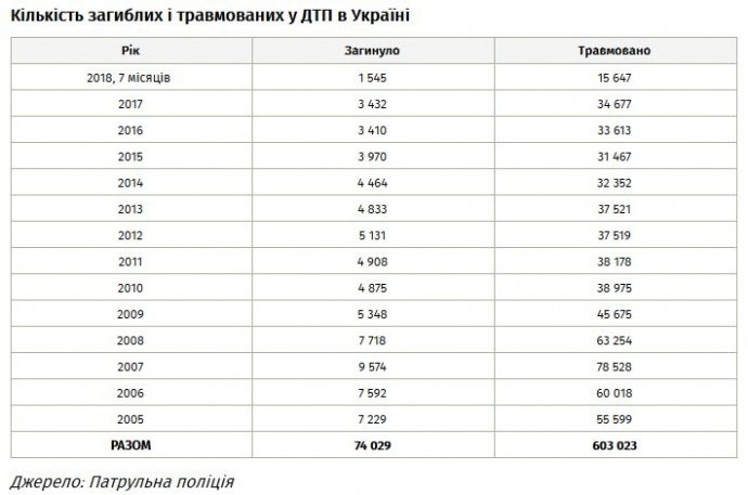 За 15 років ведення офіційної публічної статистики в Україні загинуло в ДТП 74 тисяч осіб і ще 603 тисячі осіб отримали травми.