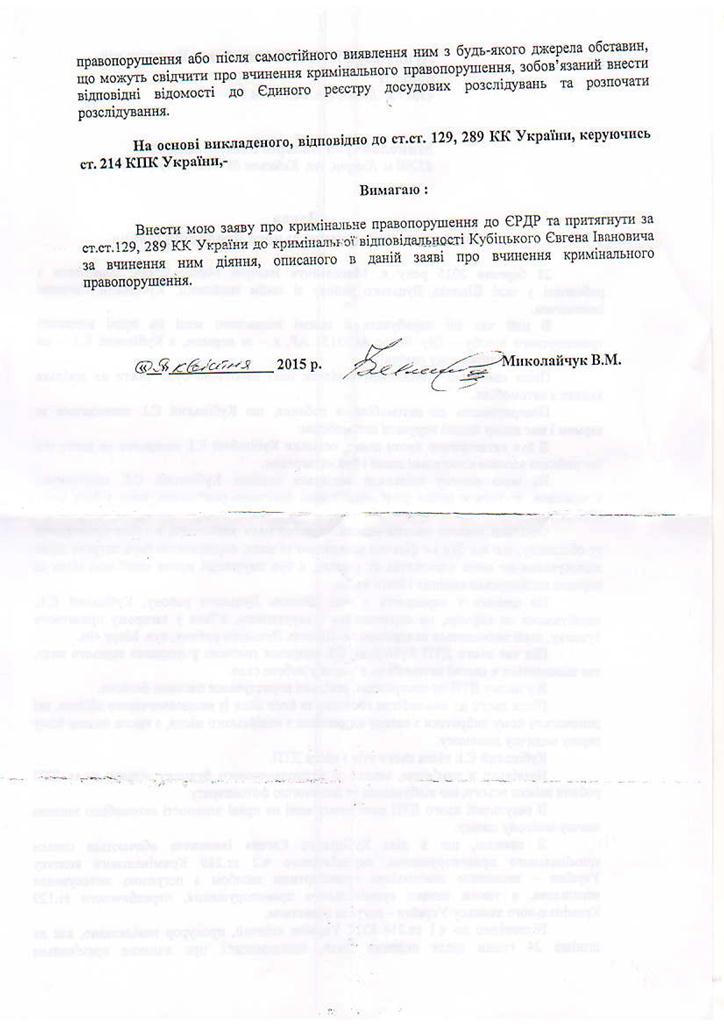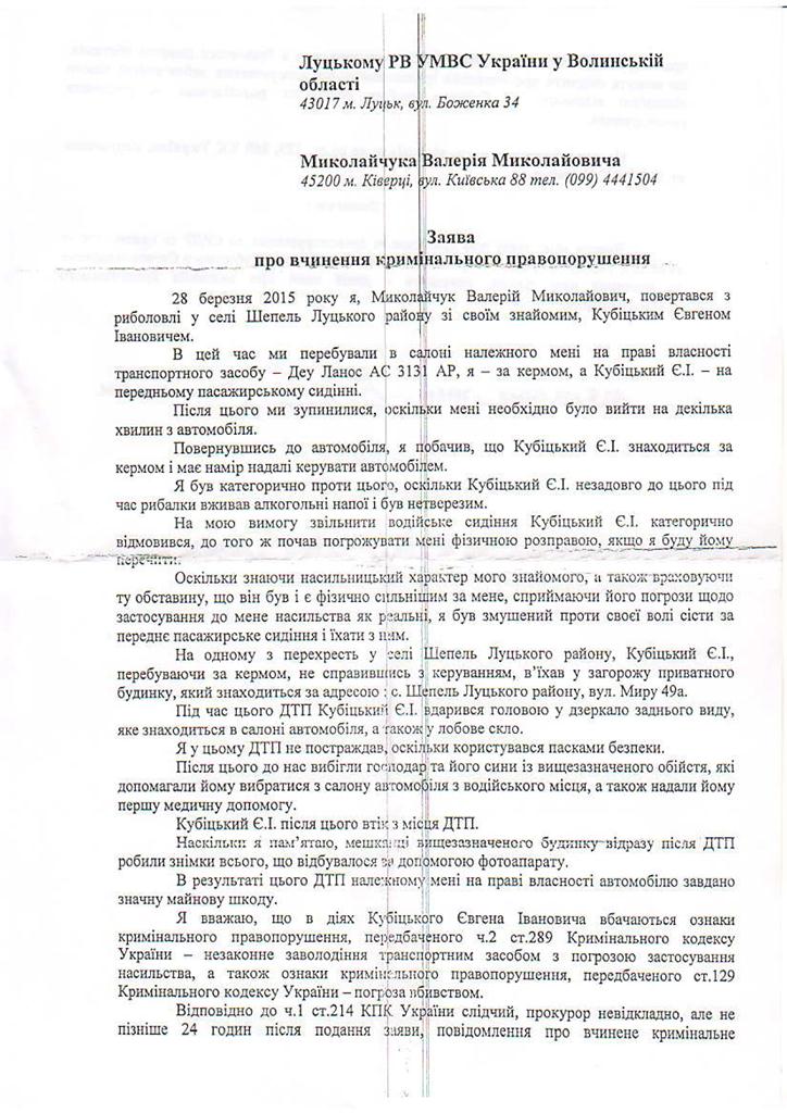 «28 березня 2015 року я, Миколайчук Валерій Миколайович, повертався з риболовлі у селі Шепель Луцького району зі своїм знайомим, Кубіцьким Євгеном Івановичем. Я був за кермом власного автомобіля Деу Ланос, а Кубіцький перебував на передньому пасажирському сидінні. Однак мені треба було на декілька хвилин вийти. А, повернувшись до авто, я побачив, що мій пасажир знаходиться за кермом і має намір надалі керувати транспортним засобом», - йдеться у тексті заяви.