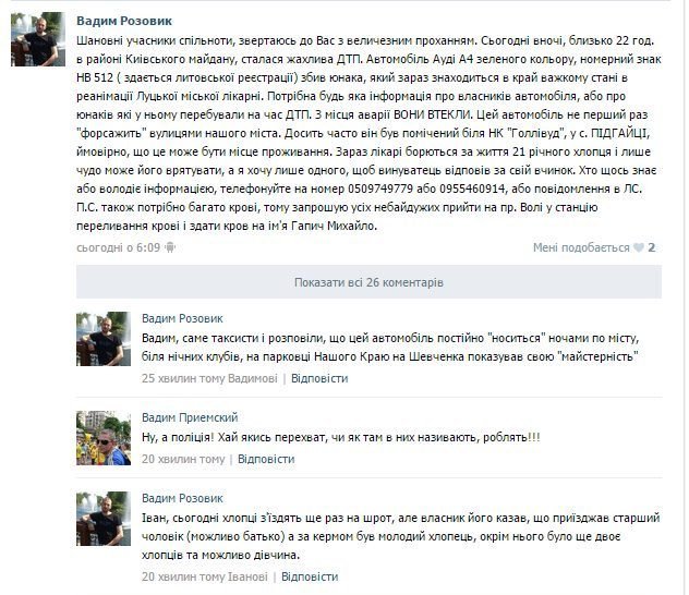 «Потрібна будь-яка інформація про власників автомобіля, або про юнаків які у ньому перебували на час ДТП. З місця аварії вони втекли. Цей автомобіль не перший раз «форсажить» вулицями нашого міста. Досить часто він був помічений біля НК «Голлівуд», у селі Підгайці, ймовірно, що це може бути місце проживання. Зараз лікарі борються за життя 21 річного хлопця, і лише чудо може його врятувати, а я хочу лише одного, щоб винуватець відповів за свій вчинок. Хто щось знає або володіє інформацією, телефонуйте на номер 0509749779 або 0955460914, або повідомлення в ЛС», - йдеться у дописі лучанина.