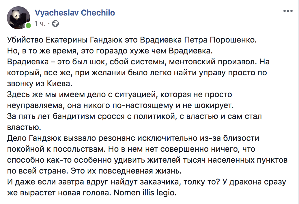 «Вбивство Катерини Гандзюк - це Врадіївка Петра Порошенка. Але, в той же час, це набагато гірше, ніж Врадіївка. Врадіївка - це був шок, збій системи, ментівське свавілля. На яке все ж, при бажанні, було легко знайти управу просто по дзвінку з Києва. Тут же ми маємо справу з ситуацією, яка не просто некерована, вона нікого по-справжньому і не шокує. За п'ять років бандитизм зрісся з політикою, з владою, і сам став владою. Справа Гандзюк викликало резонанс виключно через близькість покійної з посольствами. Але в ній немає абсолютно нічого, що здатне якось особливо здивувати жителів тисяч населених пунктів по всій країні. Це їхнє повсякденне життя. І навіть якщо завтра раптом знайдуть замовника – і що з того? У дракона відразу ж виросте нова голова. Nomen illis legio», - пише журналіст В'ячеслав Чечіло.