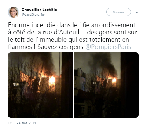 Летиція Шевальє, директор з комунікацій Exterion Media France оприлюднила у своєму Twitter фото пожежі.У 16 окрузі Парижа, де спалахнула пожежа, знаходить площа Трокадеро, футбольний стадіон «Парк де Прен», ландшафтний парк «Булонський Ліс», дорогі магазини та ресторани.