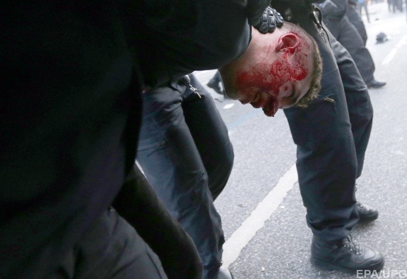 Демонстранти кидали димові шашки і скляні пляшки в поліцію. Щоб втихомирити натовп правоохоронці у відповідь використовували водомети.