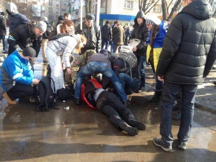 Зі слів очевидців, серед поранених є і співробітник міліції. Водночас, згідно з даними прес-служби МВС, в результаті вибуху загинула одна людина. Десять осіб отримали поранення. Вибух стався під час формування колони, яка мала йти від Палацу спорту на Площу Конституції, де планувалося проведення громадської панахиди за воїнами, загиблими в АТО.