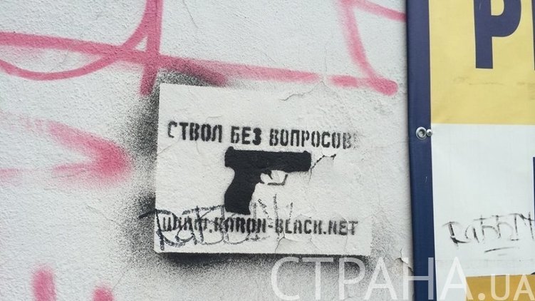 Так, у Києві стали відкрито продавати вогнепальну зброю. На стінах будинків у Дарницькому районі столиці з'явилися відповідні оголошення-картинки графіті з написом "Ствол без вопросов", де також поштова адреса був призначений інтернет-сайту продавця зброї (baron-black.net).
