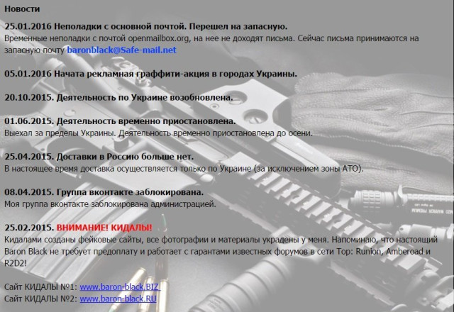 Людина з ніком Baron Black зі стартової сторінки сайту називає себе найвідомішим продавцем зброї в Україні. На сайті торговця-нелегала, ніби на підтвердження його слів, крім іншого, є два розділи - Новини та Вакансії.