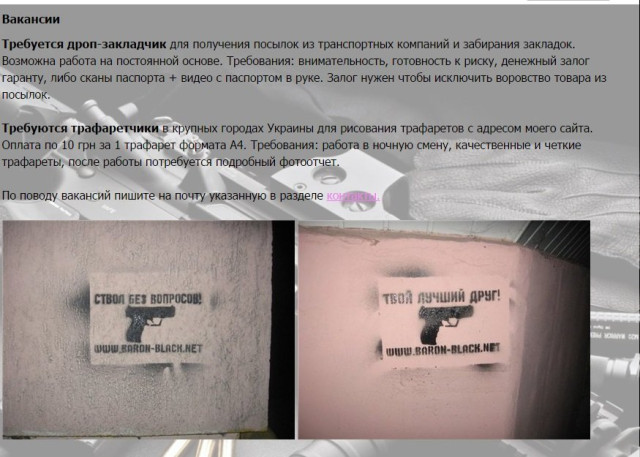 У другому розділі - оголошення про найм на роботу. Baron Black шукає дроп-закладника (людину, яка буде забирати з різних місць товар і передавати його покупцеві) і трафаретника - для малювання трафаретів з адресою сайту у всіх великих містах України.