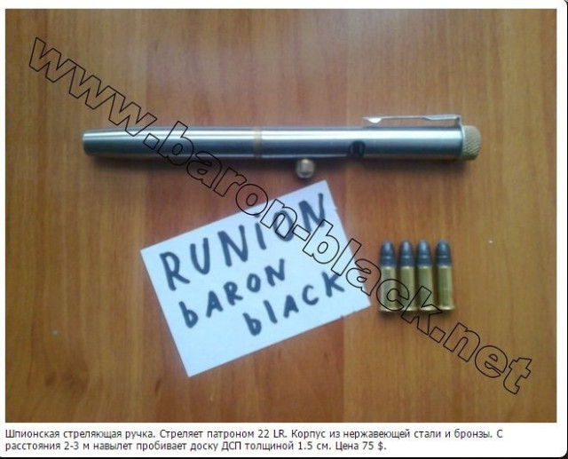 Найдешевше коштує шпигунська стріляюча ручка за 75 доларів (близько 2 тисяч гривень). Вона, як сказано на сайті, заряджається травматичними міні-патронами 22 LR (англ. Long rifle - «довгий гвинтівковиий»), і здатна з відстані два-три метри наскрізь пробити дошку ДПС товщиною 1,5 сантиментра. Всього на сайті 10 моделей бойових і травматичних пістолетів.