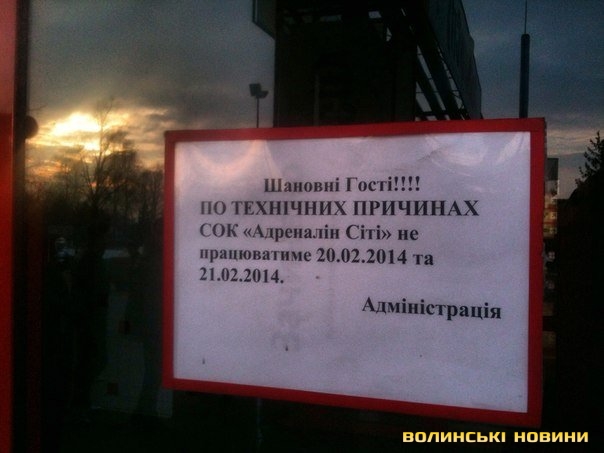 Як йдеться у повідомленні, з метою уникнення конфліктів СОК «Адреналін Сіті» 20 і 21 лютого працювати не буде.