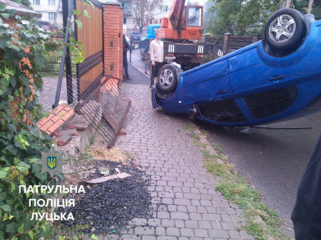 Внаслідок пригоди автомобіль перекинувся, потерпілих немає. Водій та власник будинку, поблизу якого пошкодили огорожу, домовились про відшкодування збитків.