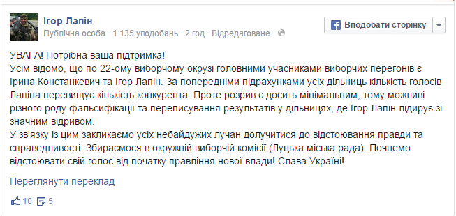 У понеділок, 27 жовтня, після 16-ої години почали надходити смс-повідомолення із телефону одного з кандидатів до Верховної Ради Ігоря Лапіна, який згідно з підрахунками ЦВК на 16.48 програє вибори. Як вбачається зі змісту повідомлень, кандидат закликав на 17 годину прийти до Луцької ОВК і вчинити певні дії, аби виграти ще півтори сотні голосів, - інформує Під Прицілом.