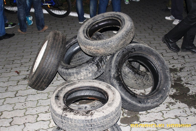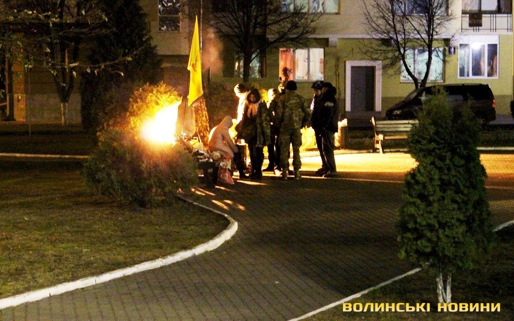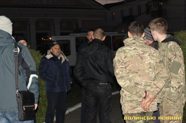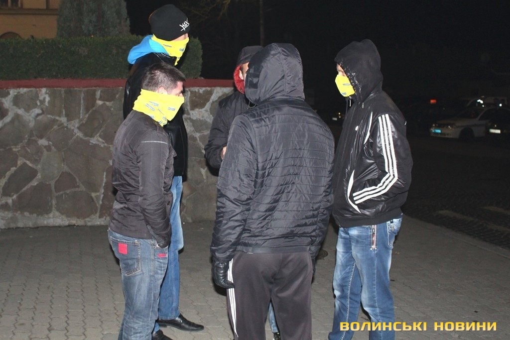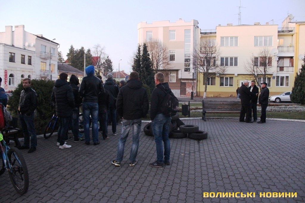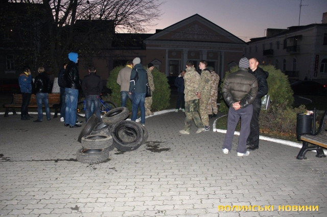 За станом на 17.30 журналісту Інформаційного агентства Волинські Новини стало відомо, що близько трьох десятків чоловіків у формі таки дійсно зібралися під стінами мерії. Вони принесли із собою шини. На запитання журналіста навіщо вони їх із собою взяли, ті відповіли: "Ми звикли носити із собою шини, наче гантелі. Але палити їх ми не збираємося. Нам повідомили, що від імені самооборонівців буде здійснена провокація. Ось тому ми зараз тут, щоб цього не допустити".Серед активістів, зокрема, є представник Самооборони Майдану Волинь Сергій Рижко. З його слів, він разом із самооборонівцями, афганцями та іншими представниками громадських організацій прийшли під стіни Луцької міськради, щоб попередити можливі провокації, які, як їм стало відомо, можуть мати місце.