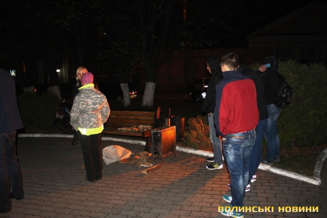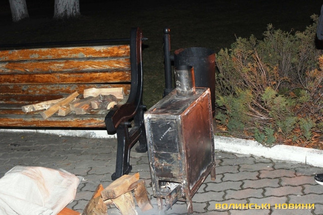 За станом на 18.20 уже зібралося біля 2 сотень людей, навпроти пам'ятника встановили буржуйку для обігріва, розпалили воготь і гріються за допомогою дров.За станом на 18.00 під стінами мерії з’явився і сам організатор заворушення - Ігор Лапін.