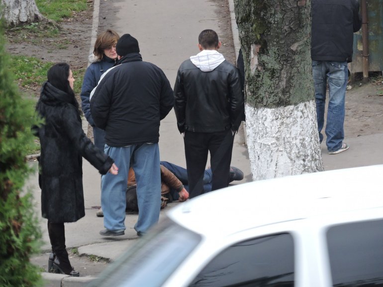 Молодий чоловік оступився, впав, сильно вдарився потилицею і вже не мав сил підвестися самотужки, обличчя залила кров. Поруч з ним були його знайомі. Вони дочекалися приїзду «швидкої» і допомогли завантажити чоловіка в автомобіль.