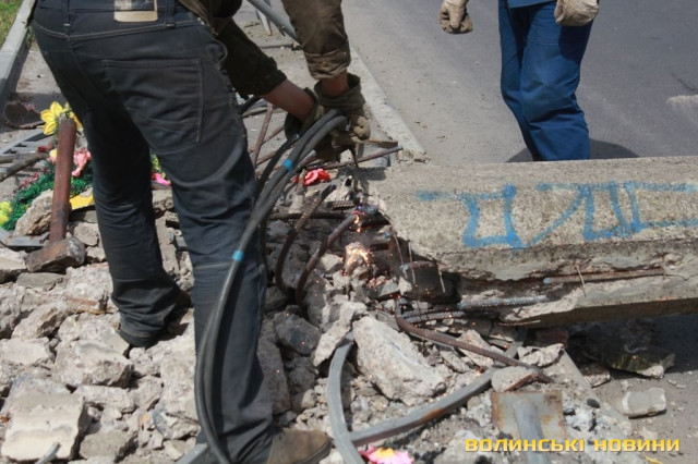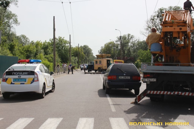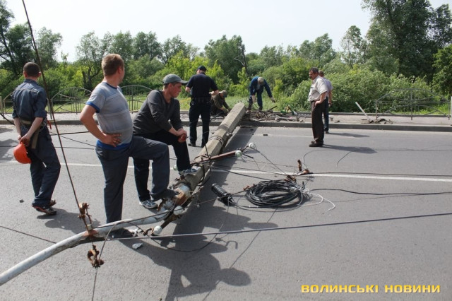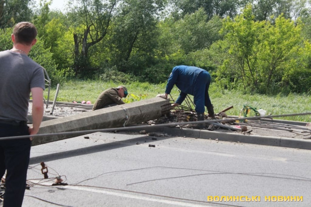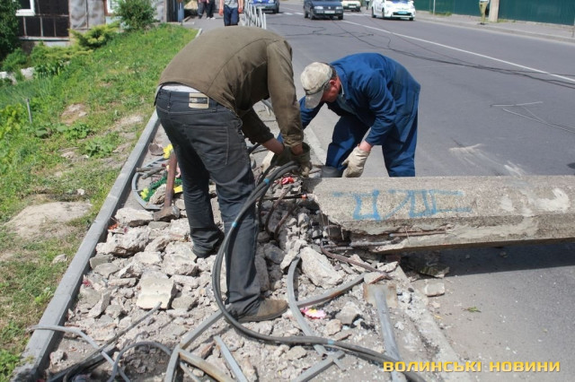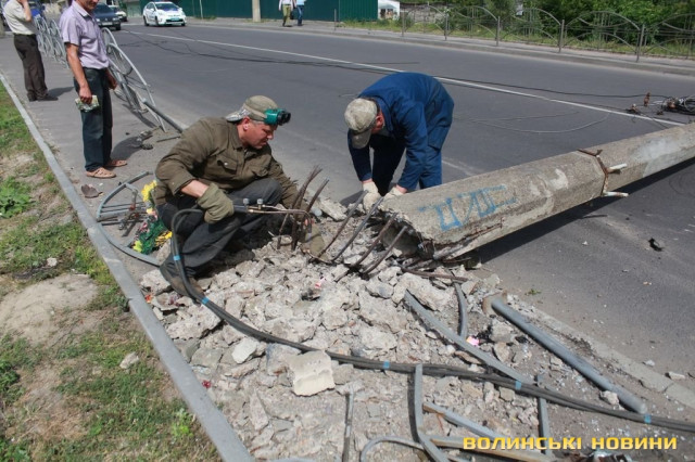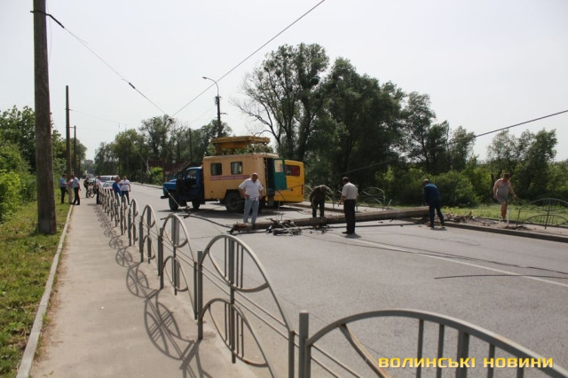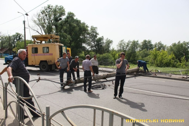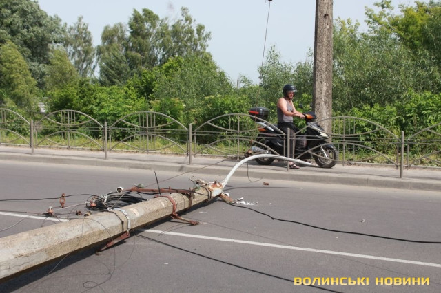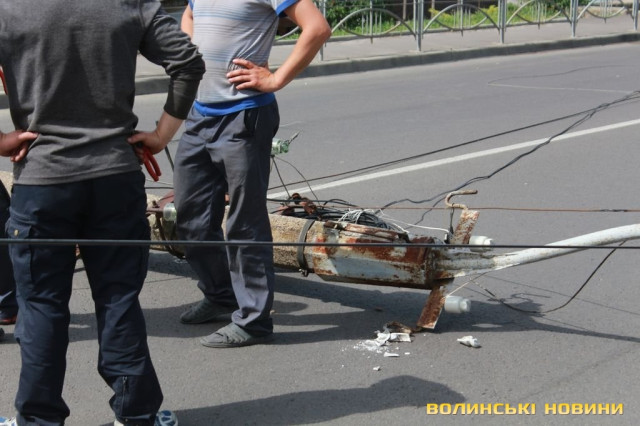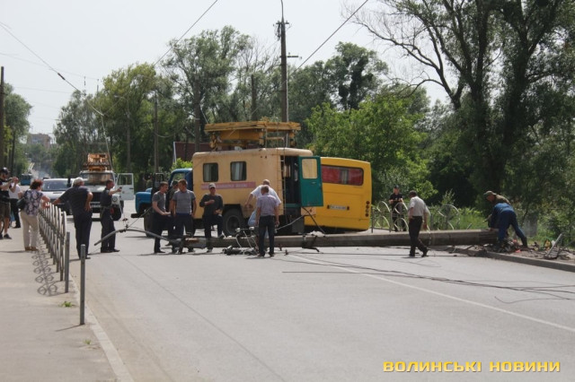 Нині рух дорогою від спорткомплексу «Динамо» до перехрестя вулиць Потебні та Гнідавської перекритий – стовп, який впав, перегородив дорогу. На місці працюють працівники Патрульної поліції Луцька та електрики, які демонтують опору та знімають тролейбусну лінію.