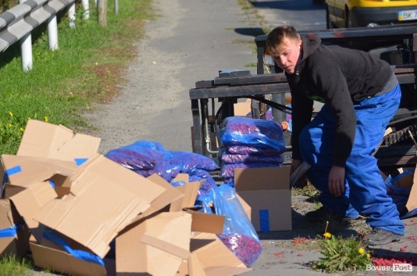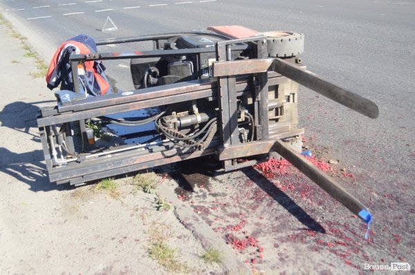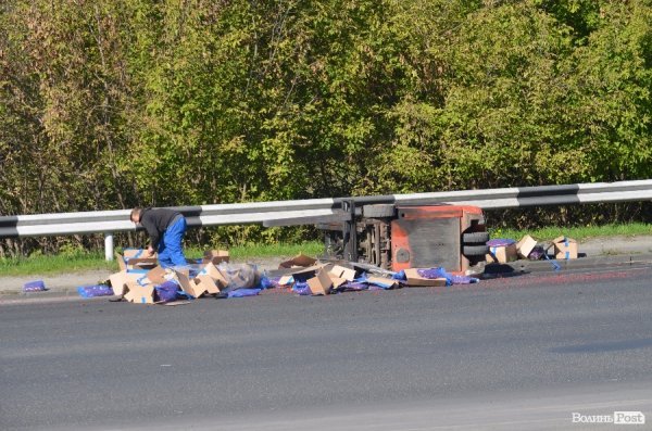 Зі слів працівників дорожньо-транспортної служби, з кузова фури, яка рухалась по вулиці Набережній в сторону центру міста, випав підйомник. Підйомний засіб злетів на проїжджу дорогу позаду машини та й ще «потягнув» з собою три-чотири десятки коробок з малиною.