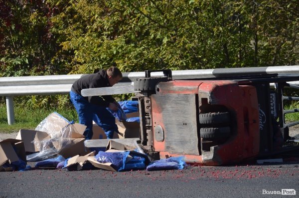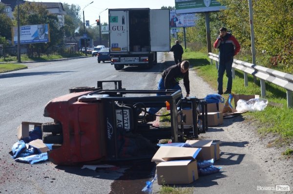 З вантажівки, яка рухалась вулицею Набережною у Луцьку, на дорогу злетіли підйомник і три десятки коробок малини.