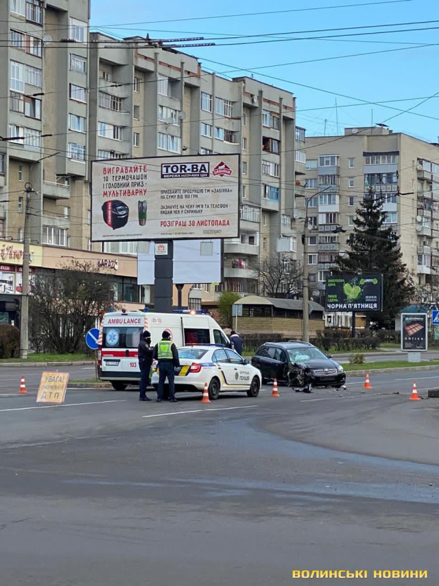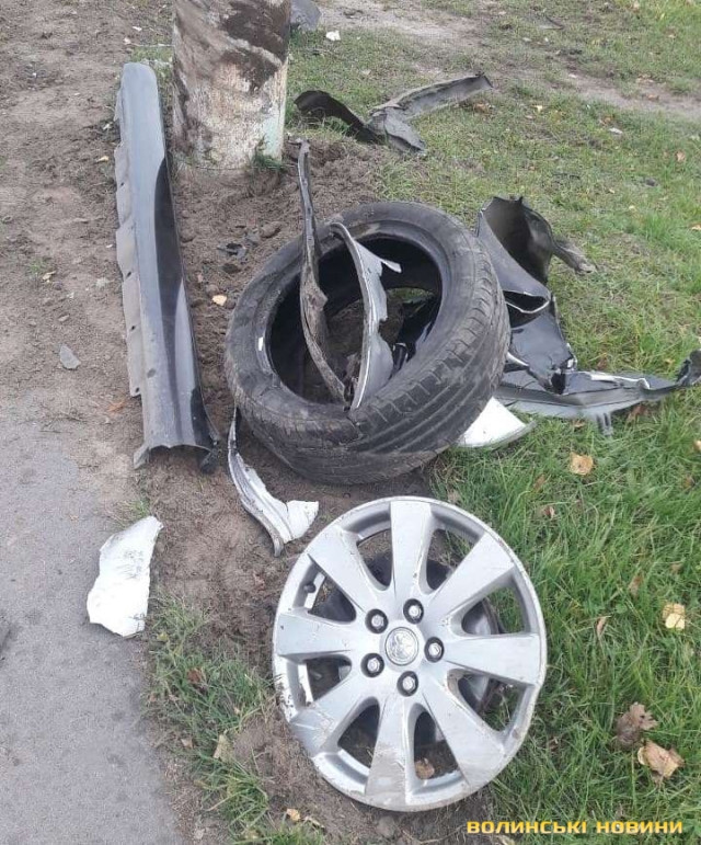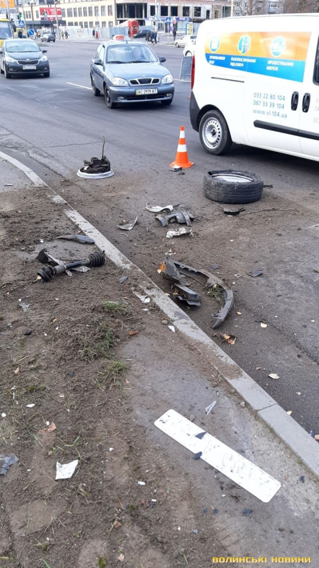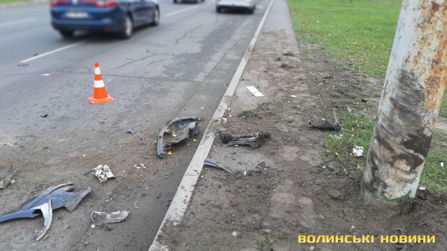 Відірване колесо та розтрощений капот: у Луцьку Toyota влетіла у стовп. Фото
