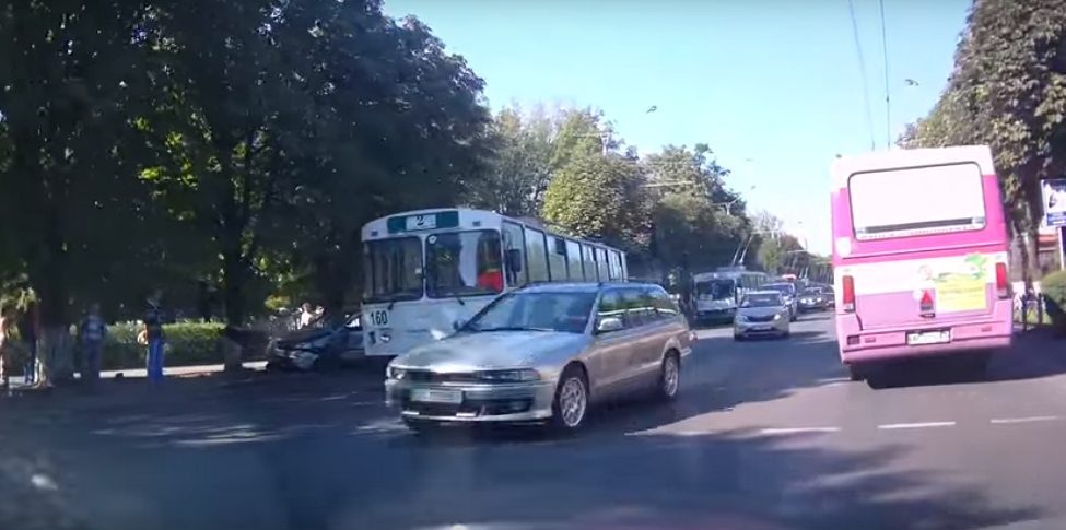 Судячи з усього рогатий вирішив проскочити на жовте, хоча таке могло бути якщо водій легковика теж хотів проскочити на жовте, а тролейбус підїзжав до перехрестя, побачив жовте і додав "газку". Запам'ятайте: жовте не для того щоб їхати, для цього зелене є! Якби виконували ПДР, то такого і не сталося б. Розумний не той хто намагається проскочити, а той хто завжди пропускає дурня!