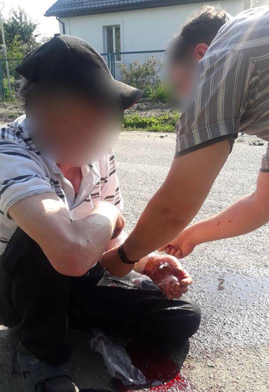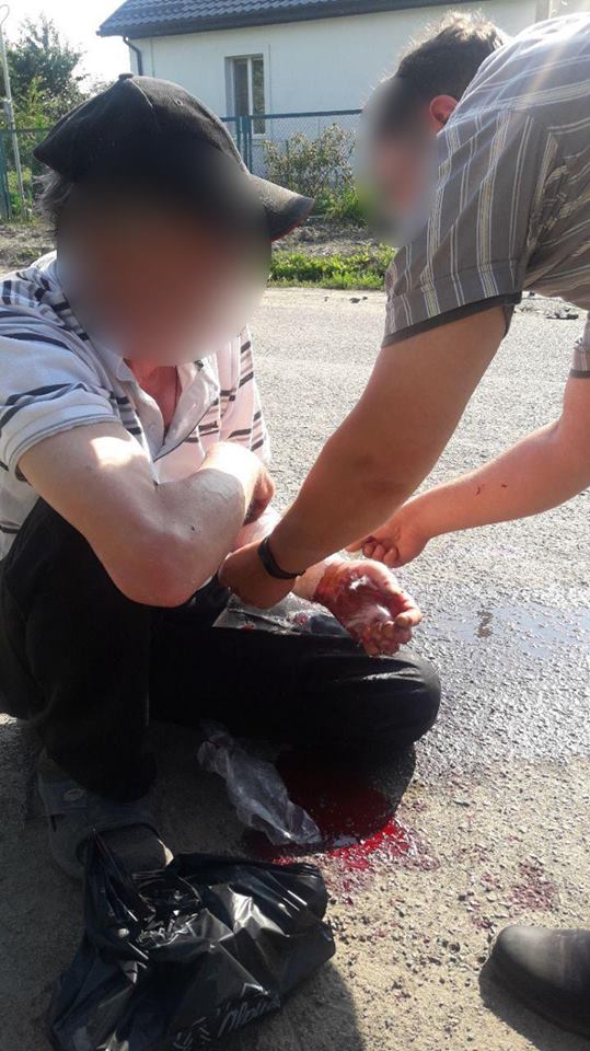 "Під’їжджаючи до дому, побачили чоловіка на землі, біля якого була калюжа крові. Якийсь водій зупинився і вже надавав йому допомогу, перебинтовував руку, давав пити воду", - йдеться у дописі.