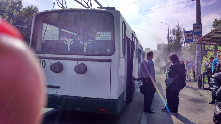 Дим ішов від заднього колеса тролейбуса. Причина займання наразі невідома, але, як розповіли очевидці, ймовірно, горіла електропроводка.