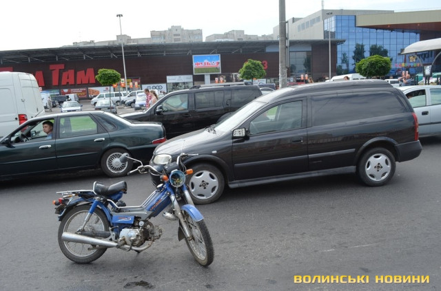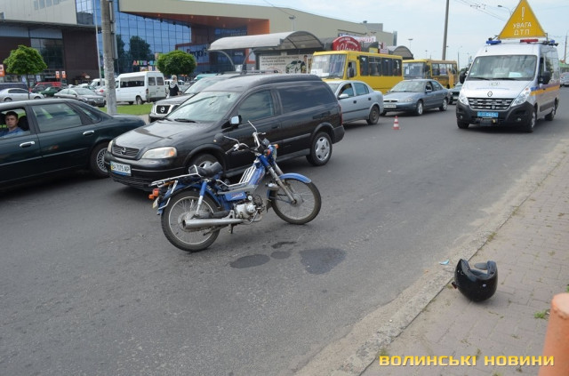 Схоже, що мопед зачепив фарою дзеркало автомобіля. На місці аварії працюють працівники Державтоінспекції.
