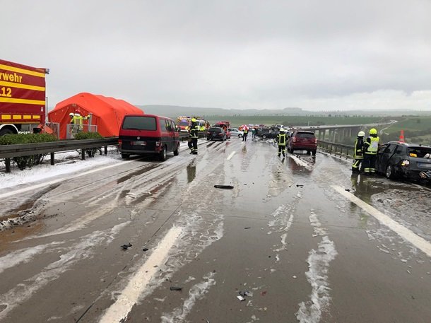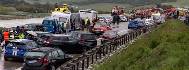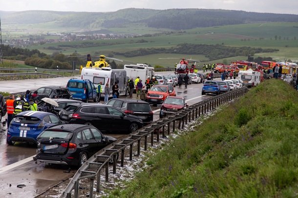У Німеччині на трасі А71 в неділю, 28 квітня, відбулася масштабна аварія з численними автомобілями. Причиною став раптовий град, після якого дорога покрилася крижаною кіркою, повідомляє Кореспондент з посиланням на MDR.