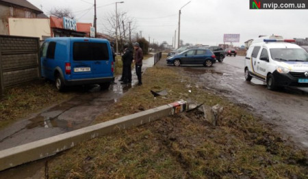 Водій автомобіля Форд не впорався з керуванням і збив опору вуличного освітлення, а також пошкодив приватну бетонну огорожу.