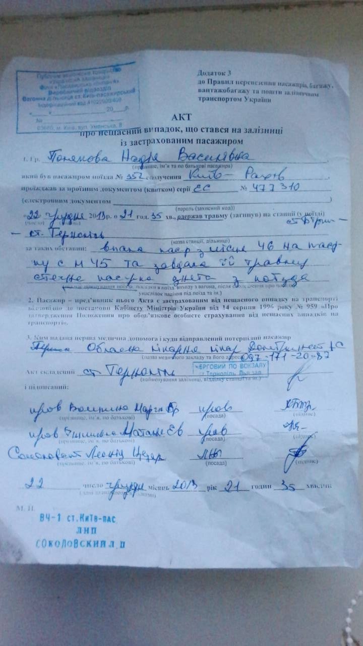 «Стався нещасний випадок з моєю мамою Поляковою Надією Василівною, 1960 р.н. Уночі, коли вона відпочивала, впала друга полиця у вагоні з жінкою. Маму терміново доставили в Тернопільську обласну лікарню, зробили МРТ, та прооперували (роздроблені пах та таз)», – повідомила вона.