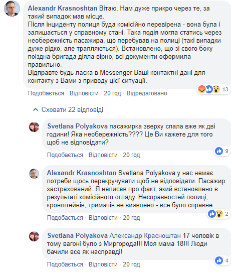 Заступник директора департаменту пасажирських перевезень «Укрзалізниці» Олександр Красноштан своєю чергою повідомив, що полиця начебто була справною, а інцидент міг статись «через необережність пасажира».