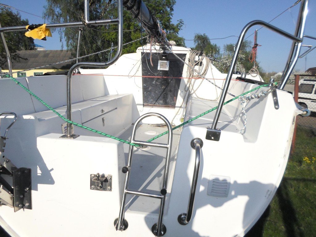 Ззаду зліва на яхті є квадратне кріплення на підвісний двигун з нержавійки і дубової дошки (35х25см).