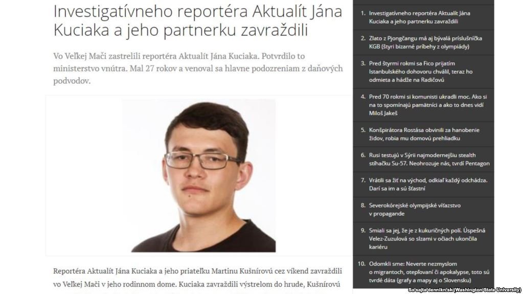 25 лютого в будинку у селі Велька-Мача, на схід від столиці Братислави, були виявлені тіла розстріляних 27-річного журналіста Яна Куцяка і його подруги Мартіни Кушнірової. Партнери по коаліції закликали прем’єр-міністра Роберта Фіцо звільнити низку високопосадовців.