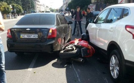 Проспектом Волі їхав мотоцикл. Його водій намагався проскочити між автівок, але не встиг. Шевроле, що саме повертало праворуч, притисло мотоцикл до позашляховика Нісан. Останній був припаркований на узбіччі.