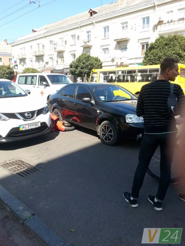 Аварія за участю мотоцикла і двох автівок сталася у центрі Луцька.