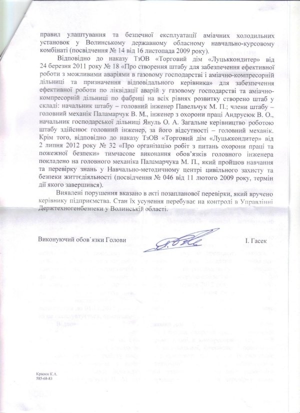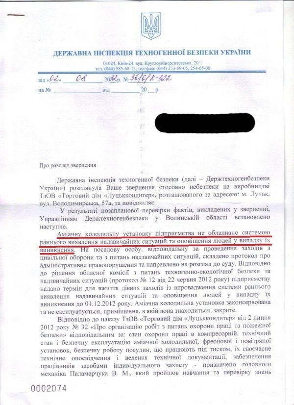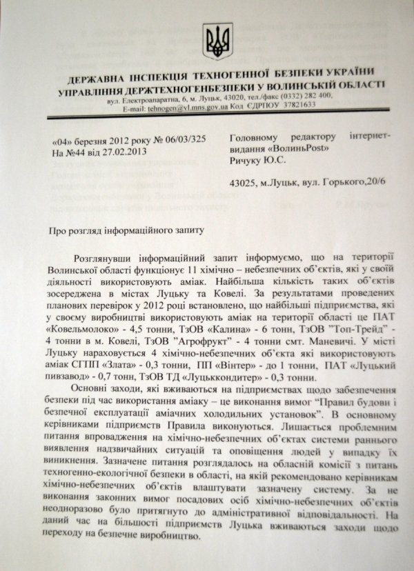 Ігор Ковальчук надав документи, які, з його слів, підтверджували його слова. 2 серпня 2012 року в Державній інспекції техногенної безпеки України повідомили: «Аміачну холодильну установку підприємства не обладнано системою раннього виявлення надзвичайних ситуацій та оповіщення людей у випадку її виникнення».