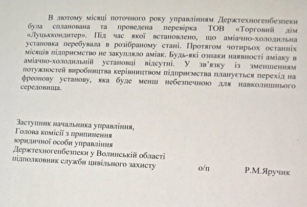 Водночас на «Луцьккондитері» не захотіли надати можливість зафіксувати на фото приміщення, де зберігався аміак - його, зі слів представника «Луцьккондитера», там уже немає. Власники фабрики заборонили будь-яку фотозйомку, - заявив заступник директора ТзОВ «Торговий дім «Луцьккондитер».