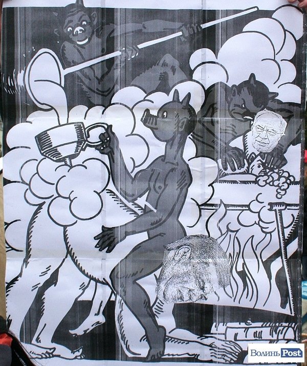 Також хтось приніс карикатуру на Віктора Януковича та Миколу Азарова. На малюнку було зображено політиків у пеклі. Януковича катували чорти.