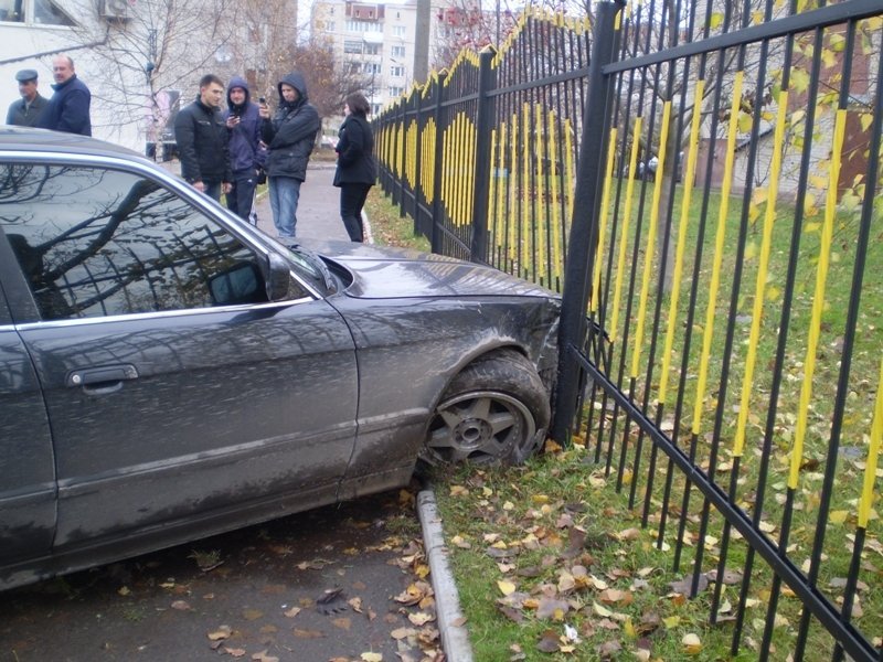 Близько 10-ї години ранку навпроти приміщення риббази, що на вулиці Конякіна у Луцьку, даішник (судячи із форми одягу) приватним автомобілем BMW виїхав на тротуар та втаранився у паркан однієї із житлових багатоповерхівок. На місце пригоди відразу прибуло два автомобілі працівників дорожньо-патрульної служби.