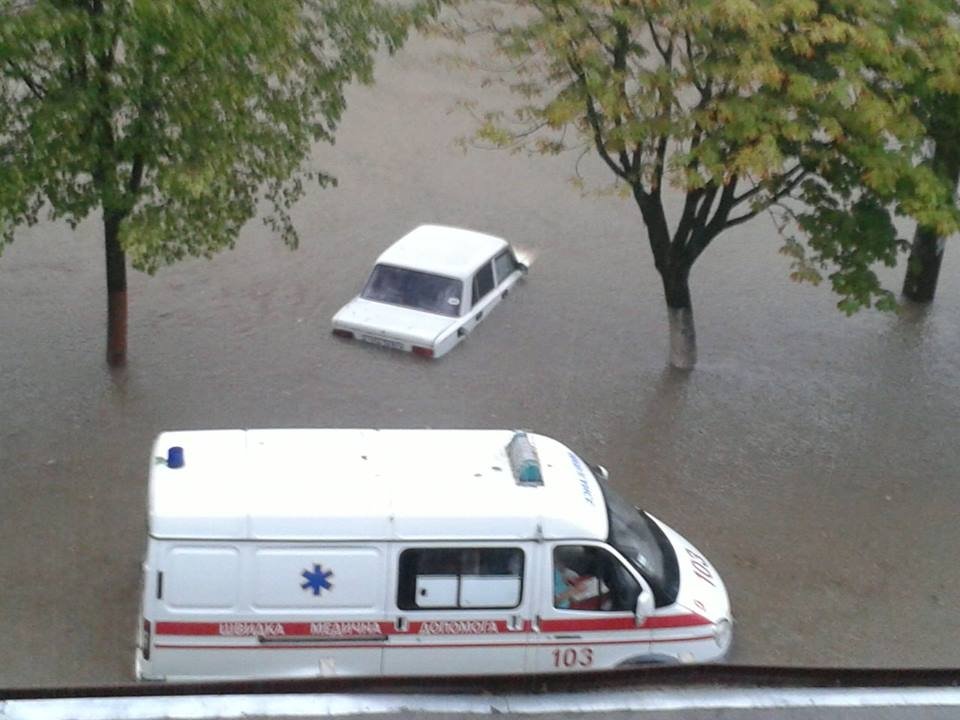У зливі потопають автомобілі швидкої допомоги. Люди ходять по пояс у воді.