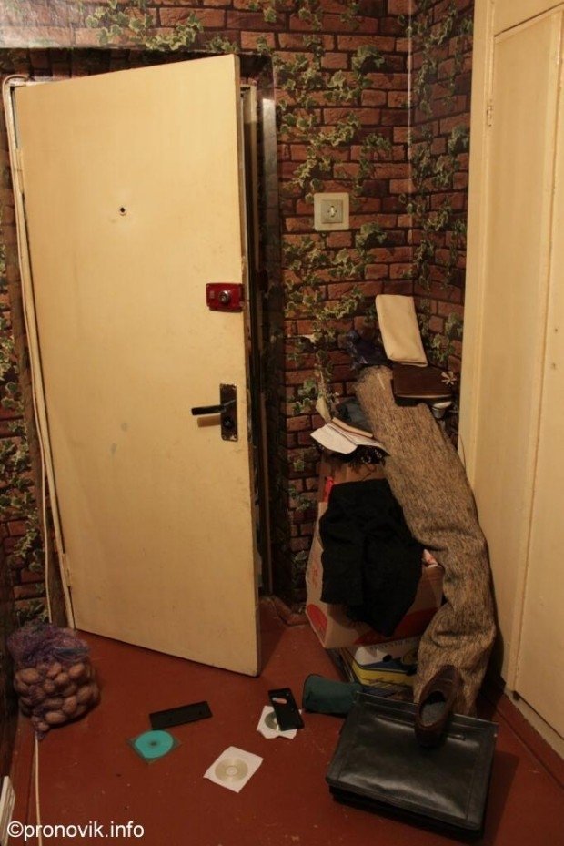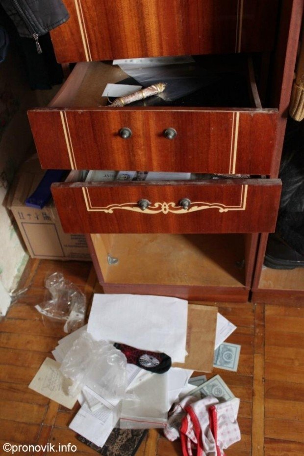 Вхідні двері вибиті, внутрішній замок зламали (від сильного удару в двері відлетів на декілька метрів). У квартирі розгардіяш. Під зіпсутими дверима – тека з численними документами й диски з записами судових засідань. Шухляди комодів, де зберігалися різні папери, вивернуті на підлогу. Більш-менш цінні речі залишилися на своїх місцях.