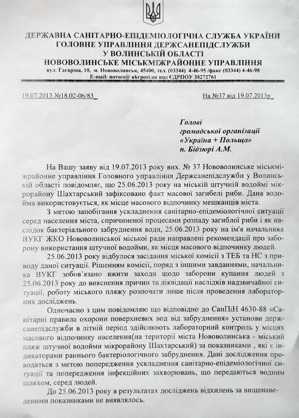 Голова громадської організації «Україна+Польща» Анатолій Бідзюра звернувся за роз’ясненнями у Держсанепідслужбу та Управління ветеринарної медицини. У ДСЕС припускають, що причиною масового замору риби став застій води, і як наслідок – задуха риби через знижений у ній рівень розчиненого кисню. Одночасно повідомили, що бактеріологічні показники у нормі.