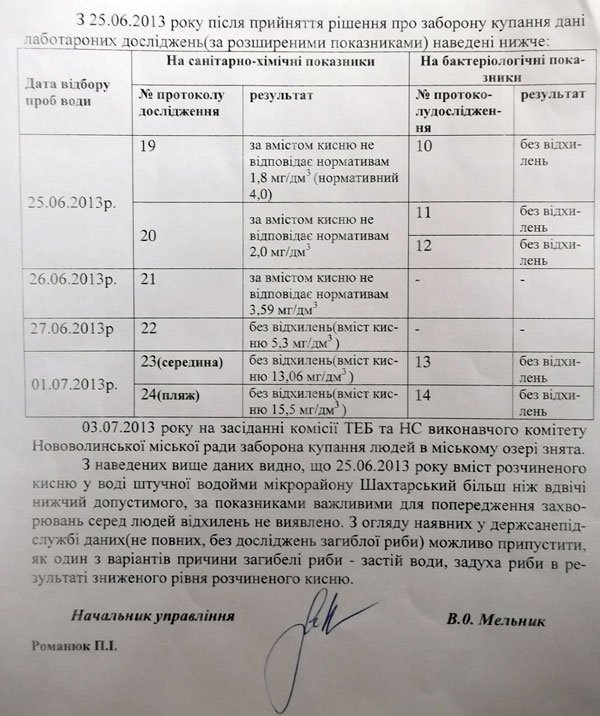 Озеро, у якому наприкінці червня загинула риба, перебуває на балансі однієї зі структурних одиниць міськради. Офіційних повідомлень від місцевої влади щодо екологічної катастрофи місцевого масштабу досі немає, хоча заборону на купання у водоймі виконком Нововолинської міської ради зняв 3 липня.