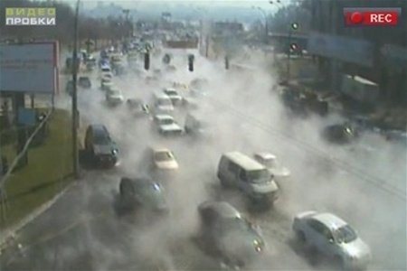 Тим часом сайт videoprobki.ua показав наслідки аварії: затоплена проїжджа частина бульвару Дружби народів, машини їдуть через сильну пару, яка обмежує видимість.