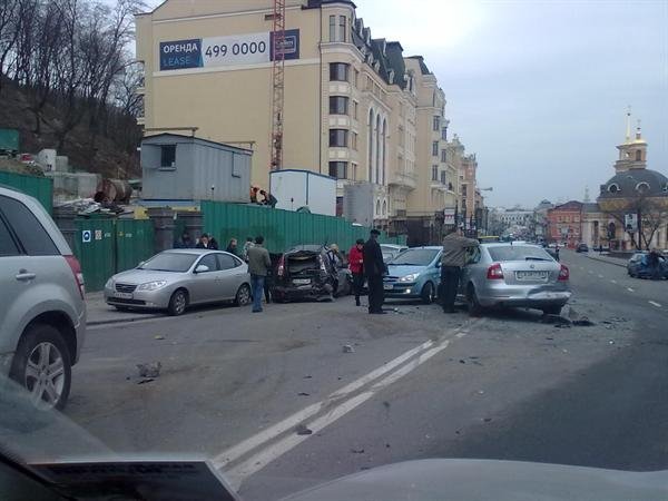 ДТП за участю декількох автомобілів відбулася вранці 28 березня у центрі Києва, на Поштовій площі. На місці ДТП - розбиті машини і калюжі крові. Даних про постраждалих поки немає.