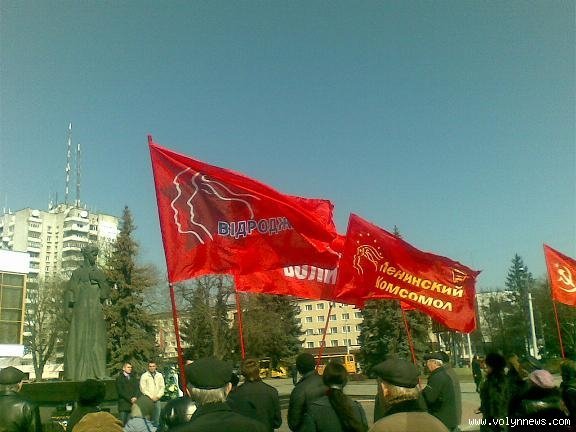 Початок мітингу комуністів та Комсомолу анонсували на 11.00 сьогодні, 17 березня. Місце проведення акції– біля пам’ятника Лесі Українці на Театральному майдані. Якраз навпроти – кафедральний Свято-Троїцький собор УПЦ КП.