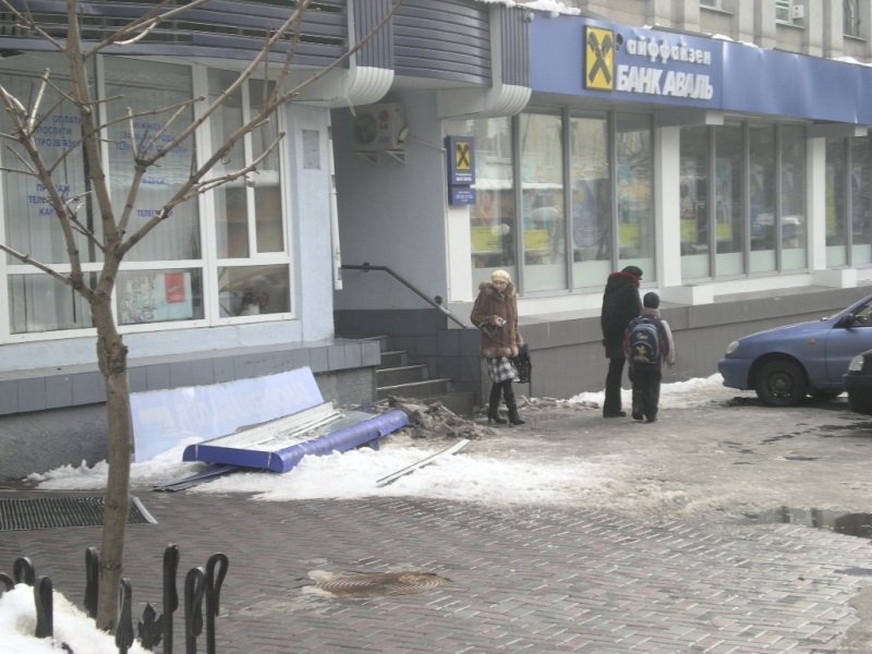 это произошло ночью 18.02. так как самого утра в пятницу уже все было на земле и констукции вывески Укртелекома и литера Р с логотипа Райффайзена и другие конструкции с покрытия ... виновата природа и халатность со стороны хозяйствеников этого здания ... всегда грязно вокруг и снега никогда не кто не чистит больно смотреть как старшие люди мучаясь подымаются этими ступенями покрытыми льдом 8(( ужас ... одно хорошо что никто не пострадал , а все ремонтируется кто то даже на этом заработает денег 8)))