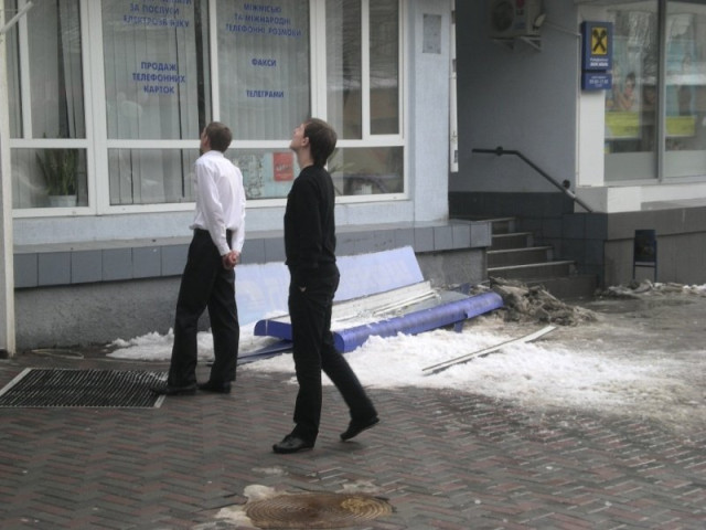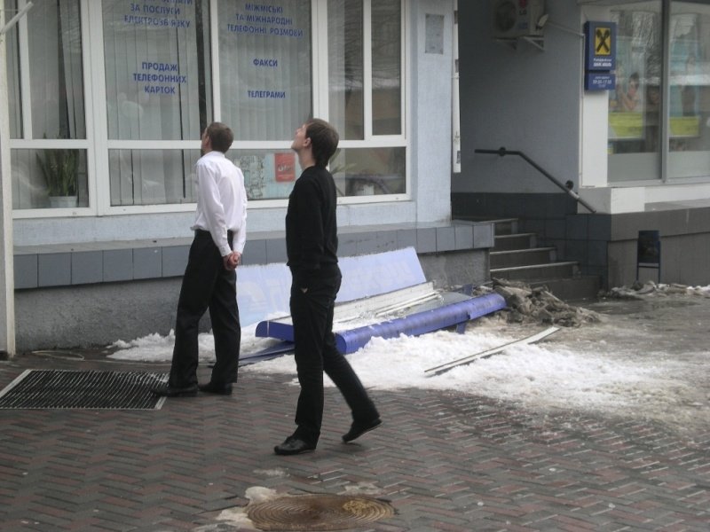 За мить із обірваного карнизу на даху навздогін вивісці падає ще одна снігова брила. Вона летить додолу і розбивається об асфальт на шматки, ледь не зачепивши двох жінок. Ті якраз виходили з приміщення відділення зв’язку. Останньої миті встигли відскочити.