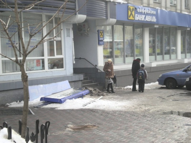 Після падіння вивіски на вулицю вибігли працівники відділення та банку «Аваль». Постояли, поохкали та розійшлися. Комунальників і ремонтників не було на місці пригоди, принаймні, впродовж півгодини, - кажуть свідки.